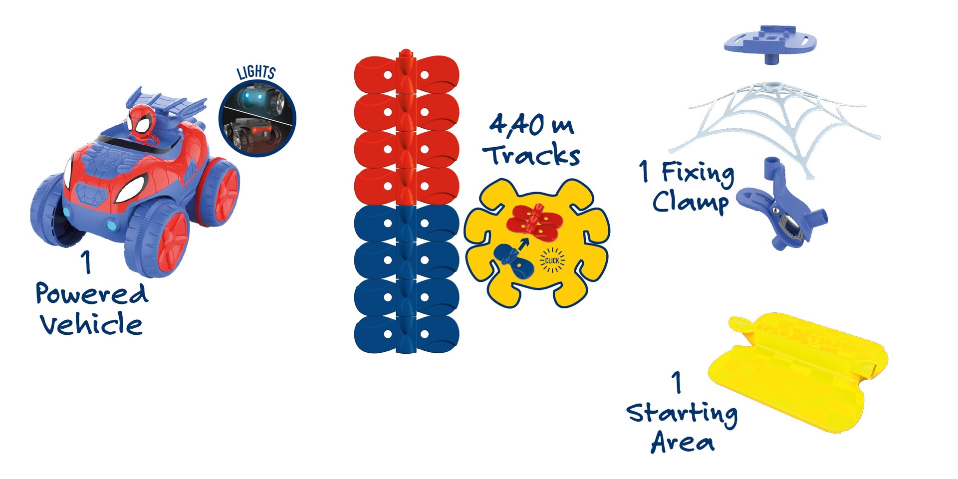 - تتضمن المجموعة 4.4 متر من المسارات (184 قطعة)، ومركبة سبايدر إلكترونية واحدة مزودة بأضواء، وشبكة تثبيت واحدة مزودة بمشبك. البطاريات متضمنة.