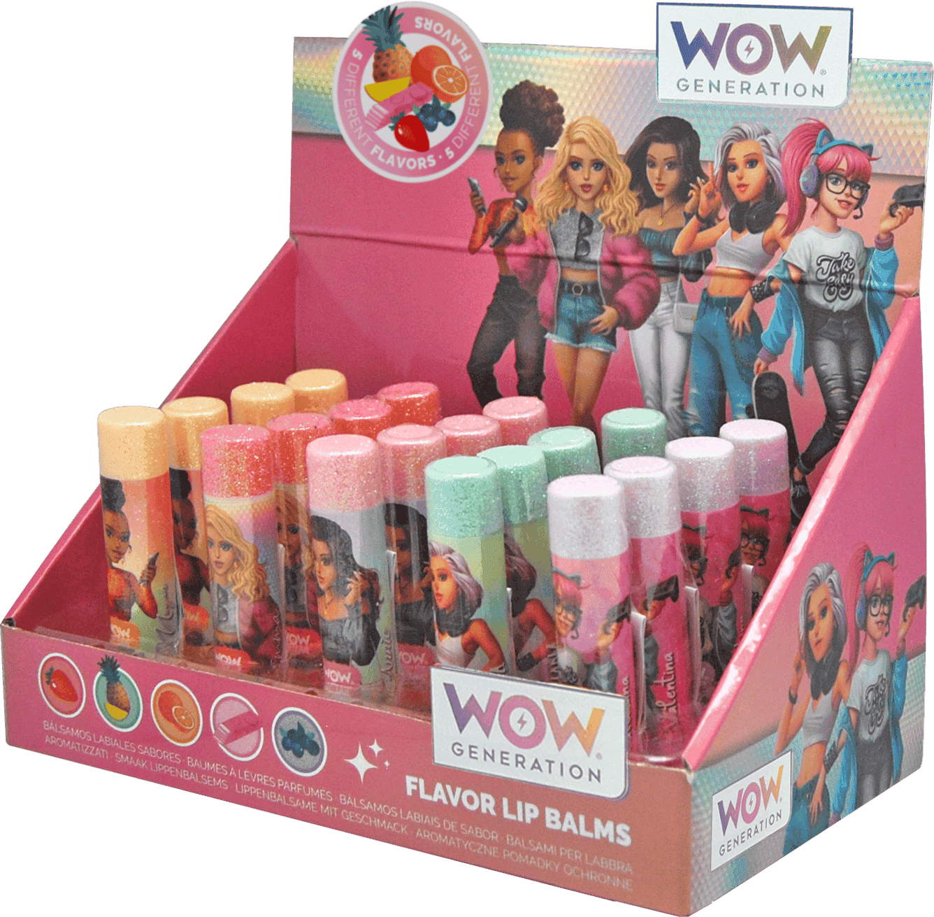 Get ready to pucker up with our WOW Generation Lip Balms! These balms will add hydration and flavor to any look, making your lips feel smooth and hydrated. With 5 delicious flavors to choose from ? strawberry, pineapple, orange, bubblegum, and blueberry ? your little one will love exploring all the different options. Feel like a total WOW Girl with these fun and fruity balms!