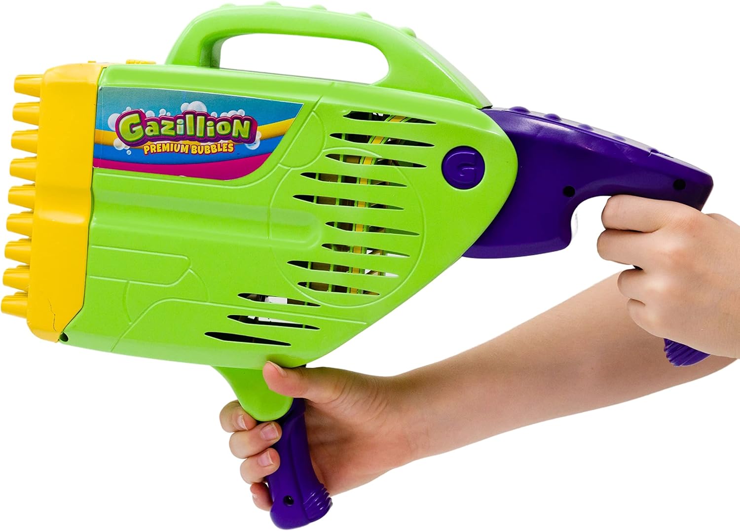 Get ready for a storm…of bubbles! The Gazillion Bubbles Stormin’ Bubble Blaster is our biggest blaster ever, and unleashes a flurry of big bubble fun! Simply dip the bubble blaster into a tray filled with Gazillion Bubbles top secret “super solution,” pull the trigger, and watch as a swarm of bubbles appears! Perfect for bubble battles and outdoor fun, the Stormin’ Bubble Blaster offers 5 seconds of continuous bubbles before needing to be re-dipped in solution! With Gazillion Bubbles, you’ll have tons and tons of bubble fun! Includes 8 oz. Gazillion Bubbles premium solution. Requires 6 AA batteries. Appropriate for ages 3 years and up.