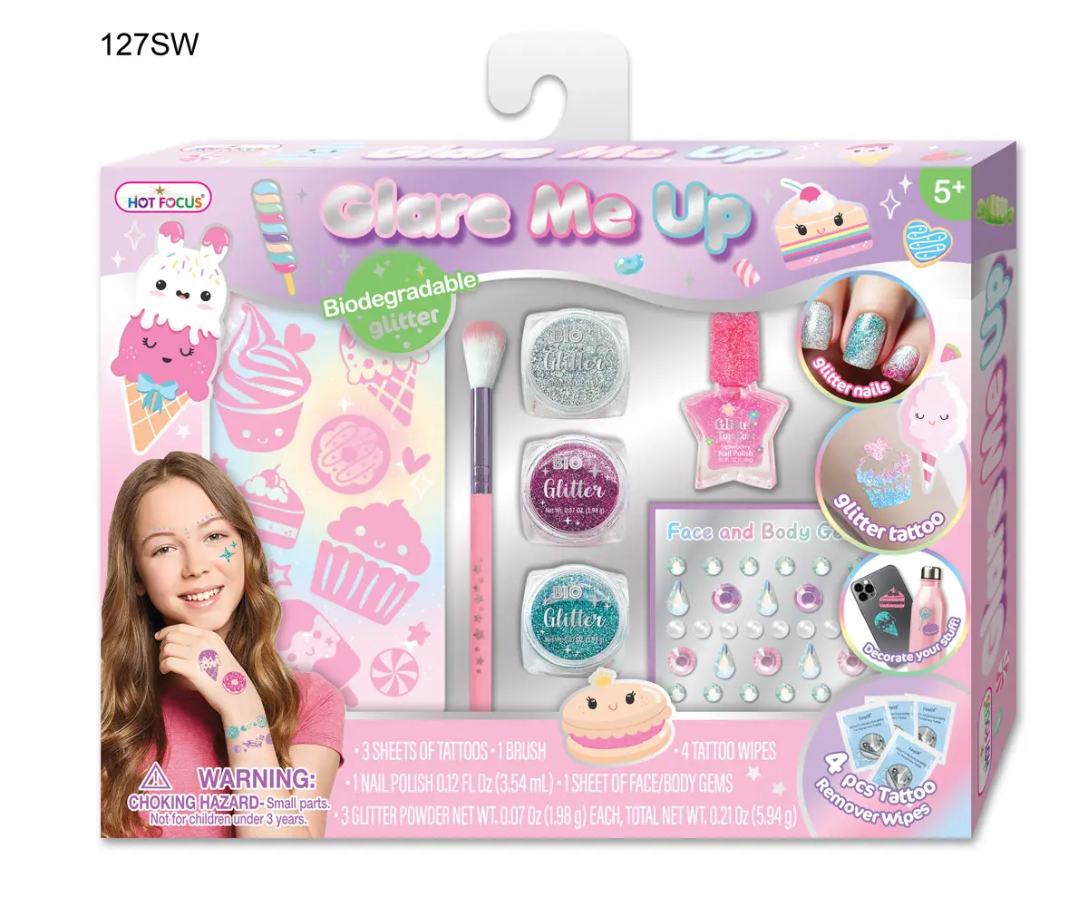 The Hot Focus Glare Me Up Set has everything kids need to sparkle, shine, and play in style! This exciting kit includes a nail polish top coat, a cosmetic brush, a sheet of face and body gems, 3 sheets of fun tattoo stickers, 3 jars of biodegradable glitter, and 4 tattoo remover wipes for easy cleanup. Safe and non-toxic, this set is perfect for creative play, parties, and dress-up, giving kids endless ways to express their imagination and glam up their look.