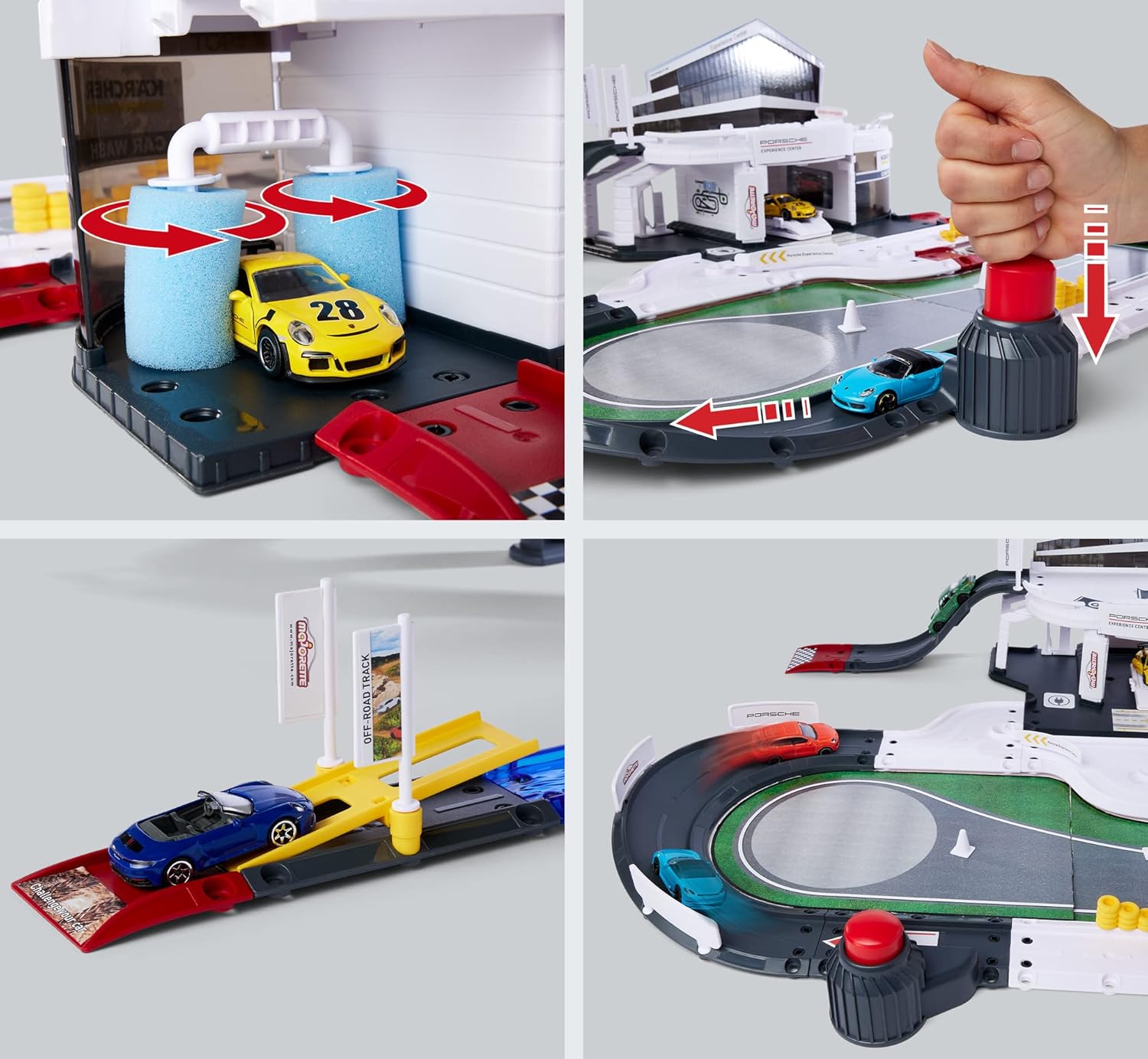Officially licensed by Porsche, this 60-piece play set includes a variety of features for endless fun. It features a Porsche Experience Center building with e-charging station, workshop, and Kärcher car wash, as well as an on-road and off-road course with various obstacles. It also comes with 5 die-cast Porsche vehicles, including exclusive models – the Porsche 911 GT3 RS with ‘Experience’ logo and the Porsche 911 Carrera S Cabriolet.