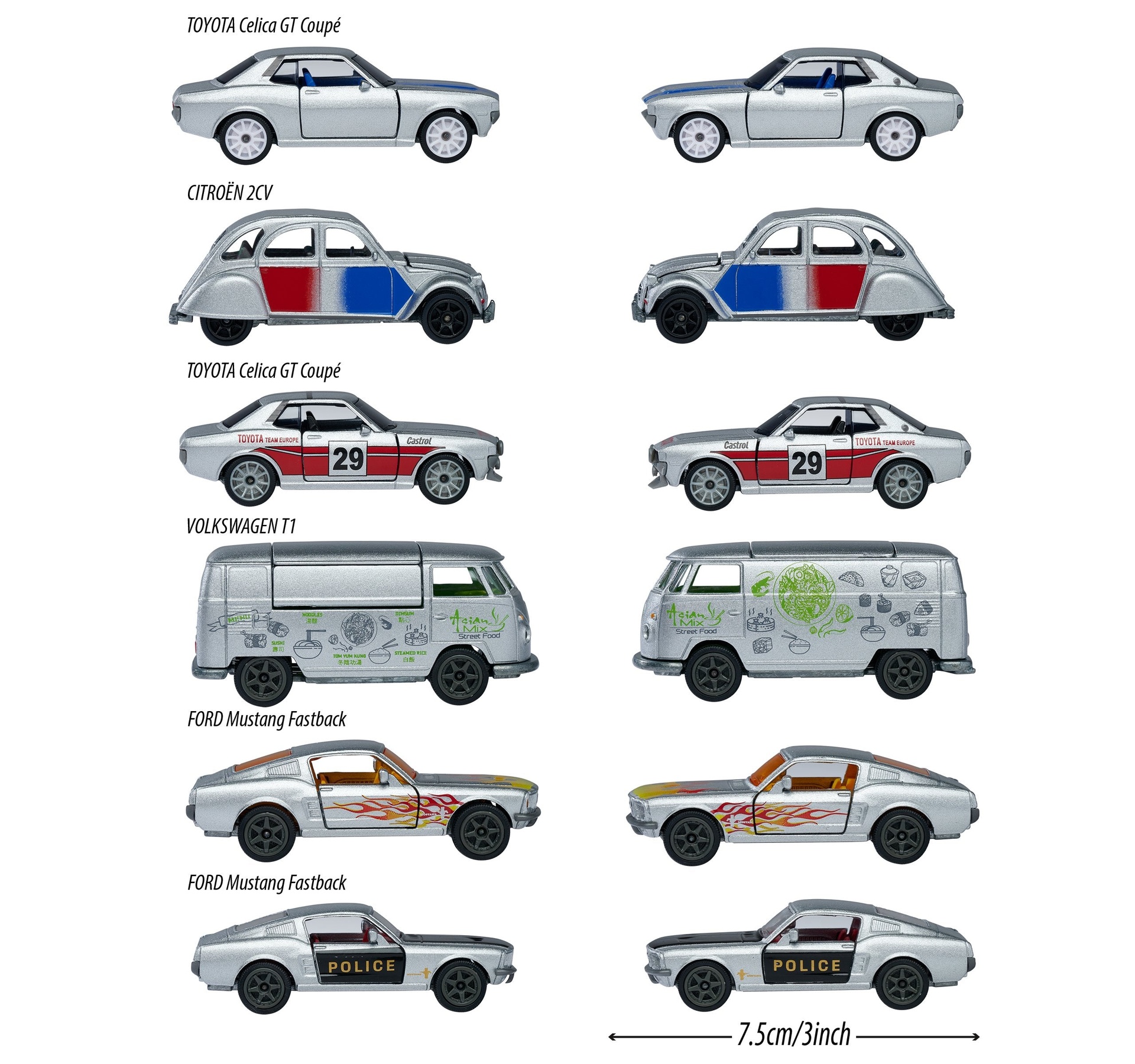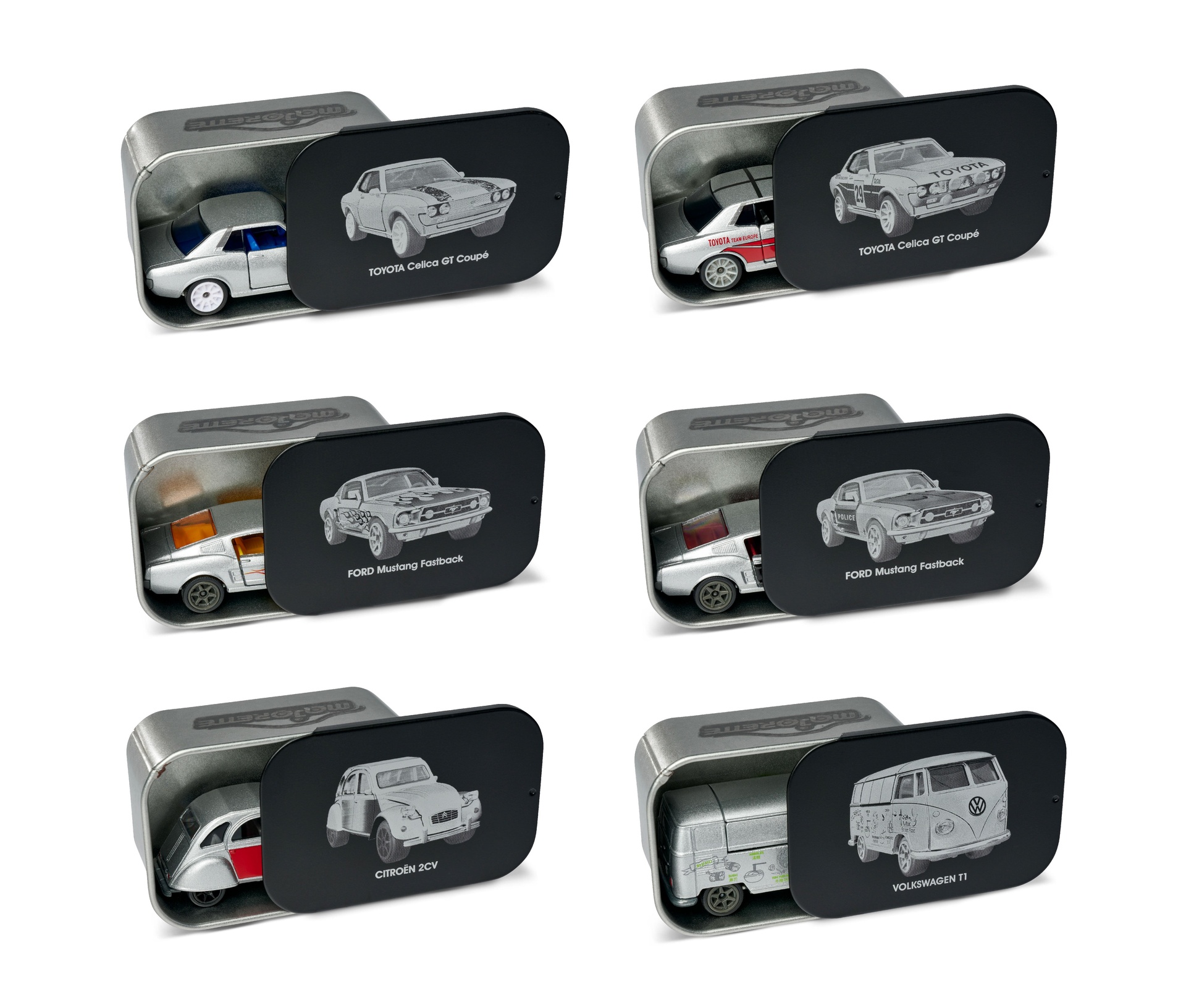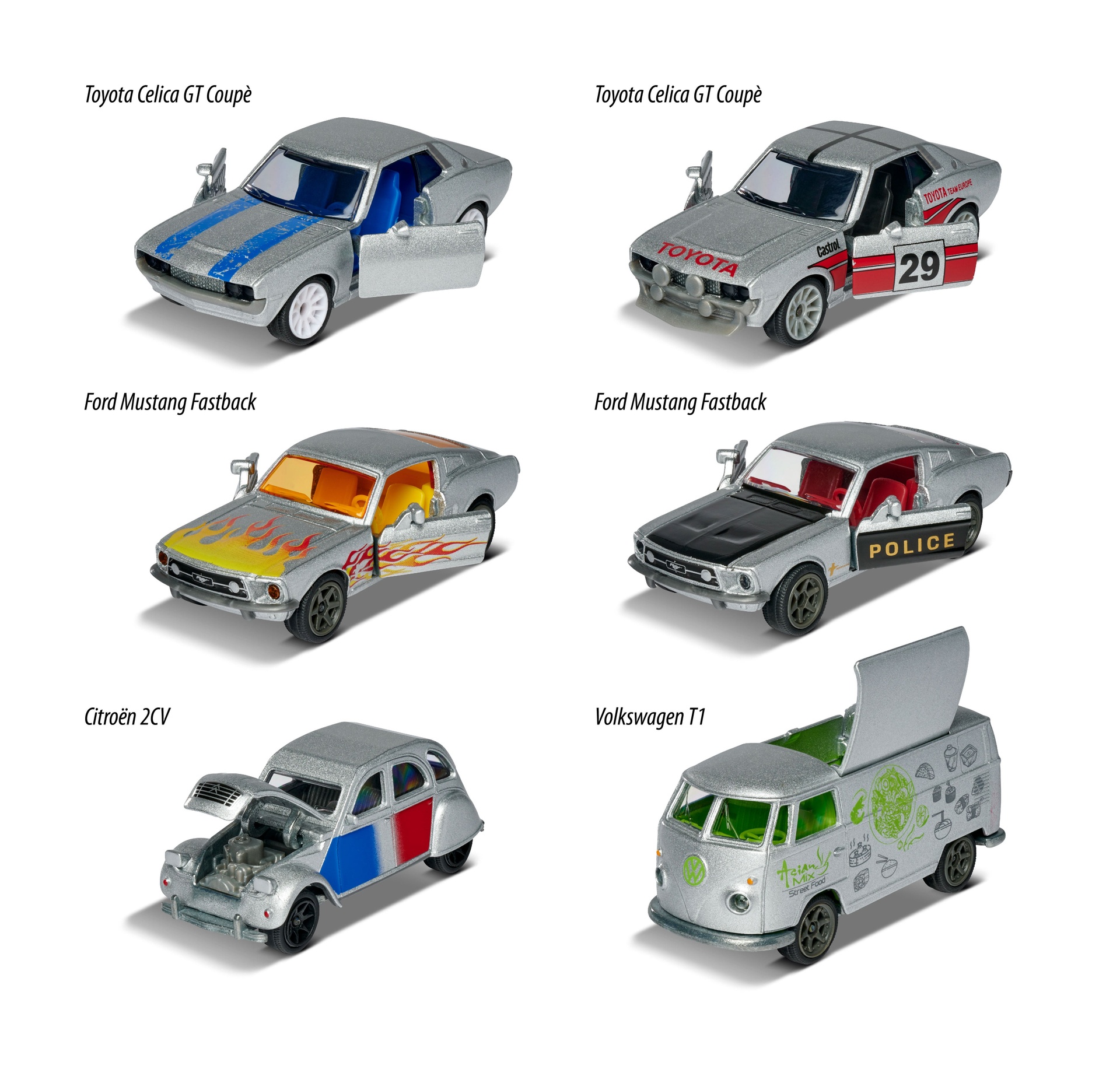 • Models: Ford Mustang Fastback “Police”, Ford Mustang Fastback “Flame”, Citroën 2 CV, Toyota Celica GT Coupé Ralley, Volkswagen VW T1 Foodtruck