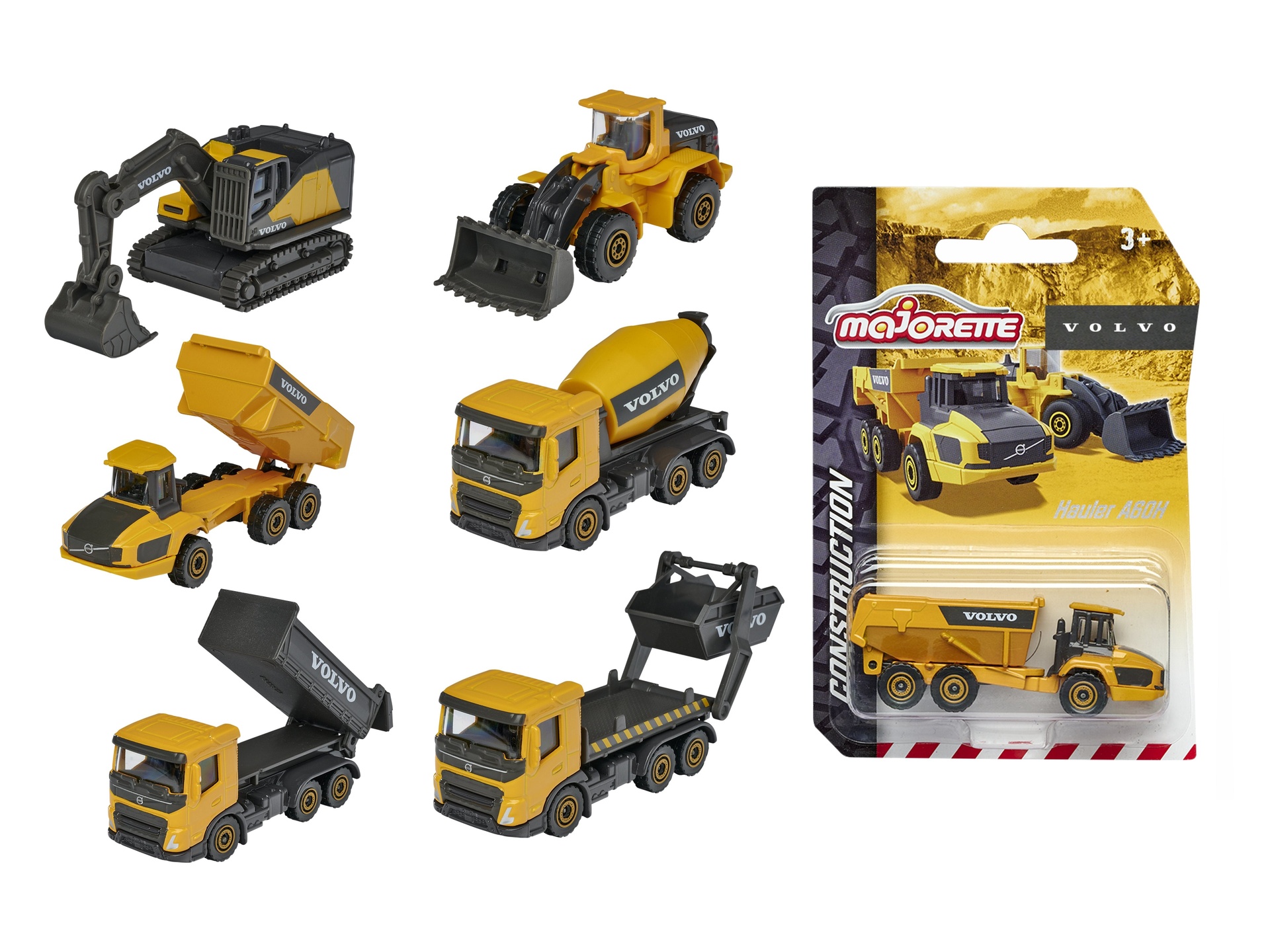- Majorette – Volvo construction vehicles – excavator, dump truck, wheel loader, concrete mixer, articulated truck, truck with container