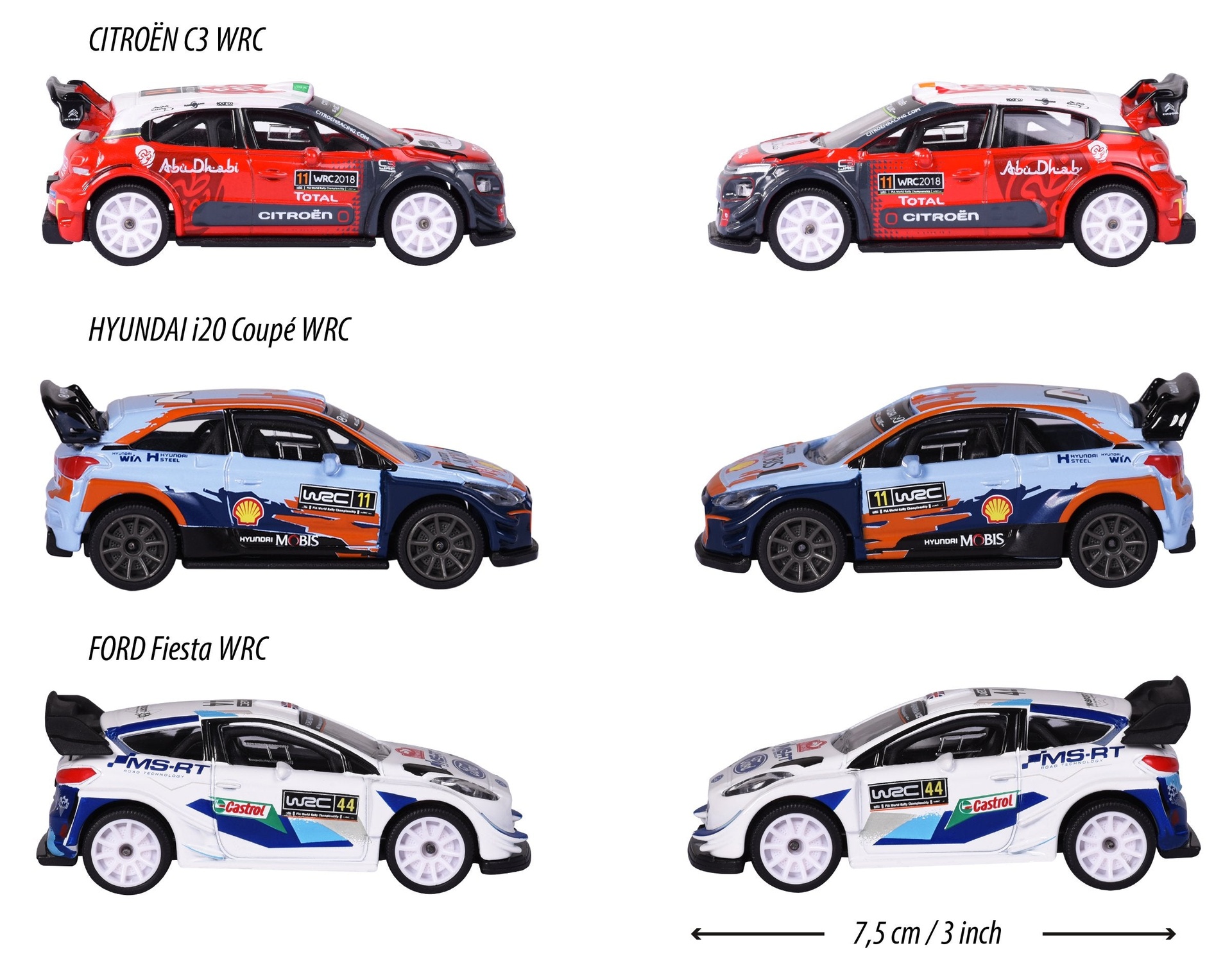 From the original WRC logos to the detail of the models, the four different toy cars with free-wheel and high-quality, die-cast bodies replicate the big racers.