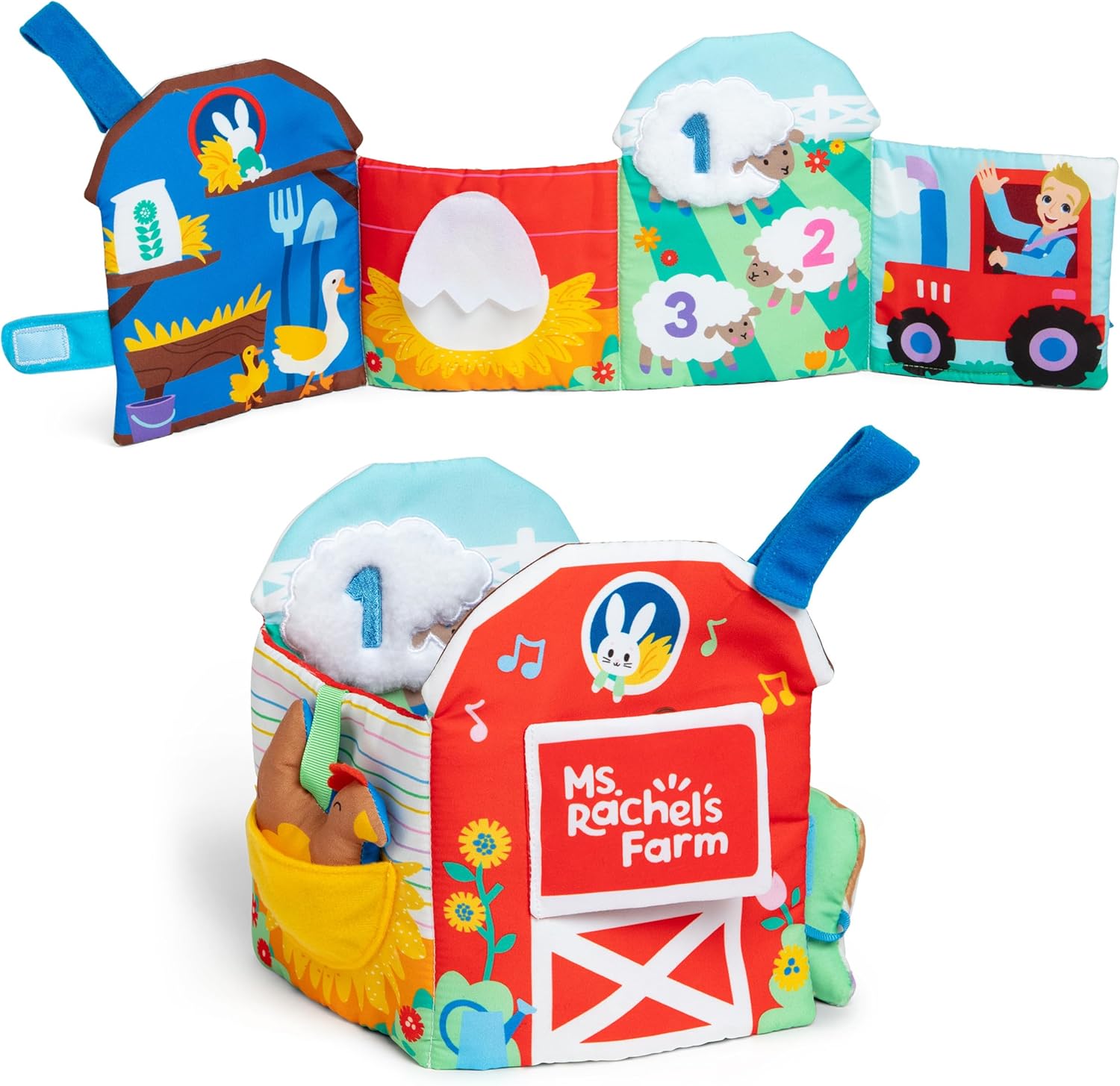 • OFFICIAL MS. RACHEL SENSORY TOYS: Soft, farm-themed baby developmental play set with 8 animal environments, a plush toy cow, colorful ribbons, and peek-a-boo crinkle flaps