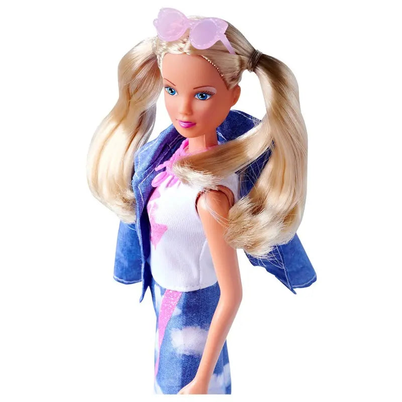 Steffi wears a fashionable jeans outfit, with skirt and jacket, glitter elements and sunglasses. – The measure: 29cm. – Recommended Age: Suitable for 3 years and above.