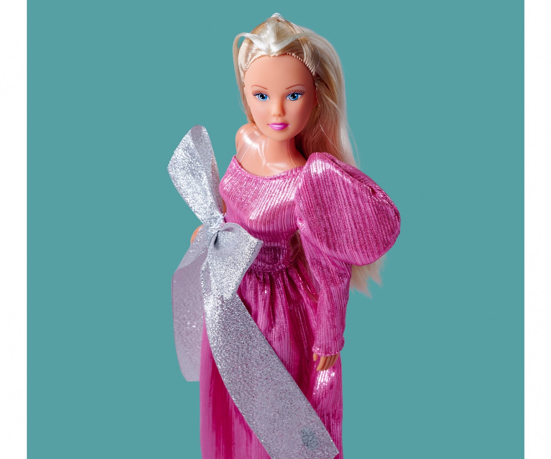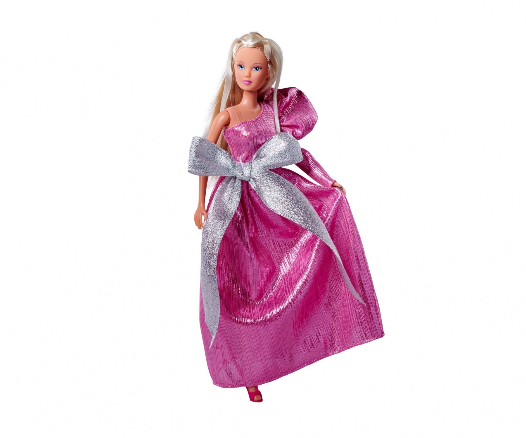 Bow love – Steffi enchants in a breathtaking pink evening dress with puff sleeves and a huge silver bow. – She’s ready for the red carpet in this outfit Shimmery. – The asymmetrical dress has a great shimmer and shines beautifully. – Steffi is 29cm tall.